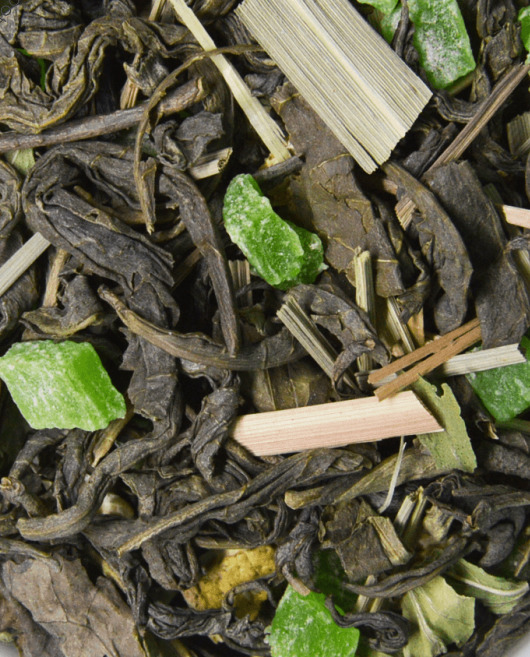 Зеленый крупнолистовой чай Ганпаудэр, цедра лайма, мелисса. Ароматизирован натуральными маслами.Температура заваривания - 85-90. Время заваривания - 1-2 мин.