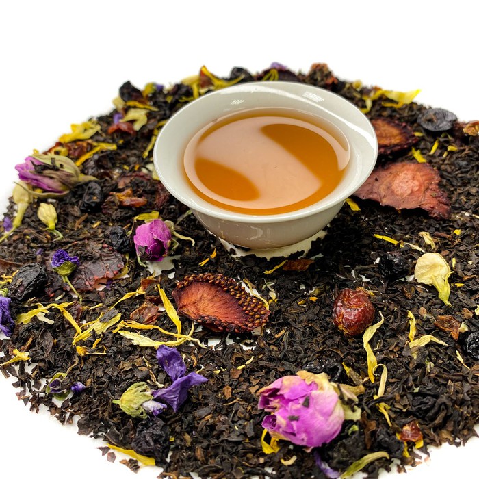 Чай черный, кусочки клубники, смородина, шиповник, жасмин, лепестки розы, календула, василек. Ароматизирован натуральными маслами.