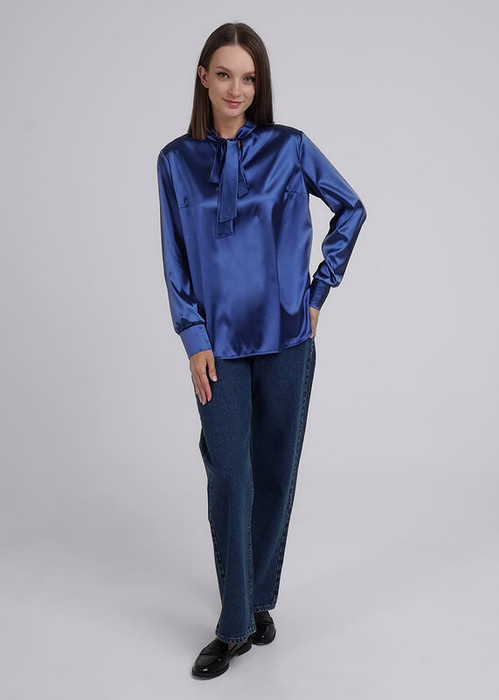Блузка из атласного полотна, с втачным длинным рукавом. Низ рукава обработан притачным манжетом с застежкой на 1 пуговицу. На груди вытачки. Горловина с вырезом ""капелька"" с завязкой на бант. Низ изделия полукруглый.