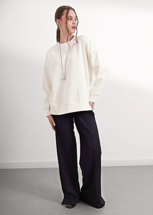 Брюки из трикотажного поливискозного полотна джерси, прямого кроя. По талии притачной пояс на внутренней резинке. По переду застроченные защипы. Боковые карманы с отрезным бочком.