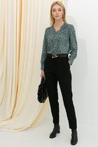 Брюки прямые, широкие из текстильного полотна штапель. Притачной пояс со шлевками, гульфиком и застежкой на молнию, крючок. Боковые карманы с отрезным бочком. По спинке вытачки, спереди металл нашивка на шлевке.