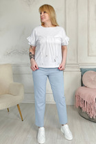 Брюки прямые с ц/в поясом спереди и притачным поясом по спинке. 5 шлевок. Спереди карманы, гульфик, застежка на молнию и 2 пуговицы. По спинке вытачки, листочки. Заутюженные стрелки спереди и на спинке.