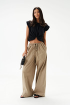 Брюки зауженные из трикотажного полотна джерси. По талии притачной пояс со шлевками, сзади на внутренней резинке. Спереди нефункциональный гульфик. По переду застроченные защипы. Боковые карманы с отрезным бочком.