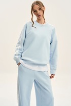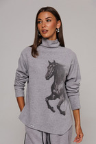 Вязаный джемпер из акриловой пряжи, переплетения гладь. Втачной длинный рукав. По низу рукава и изделия манжеты. Округлая горловина с бейкой. По переду косы.