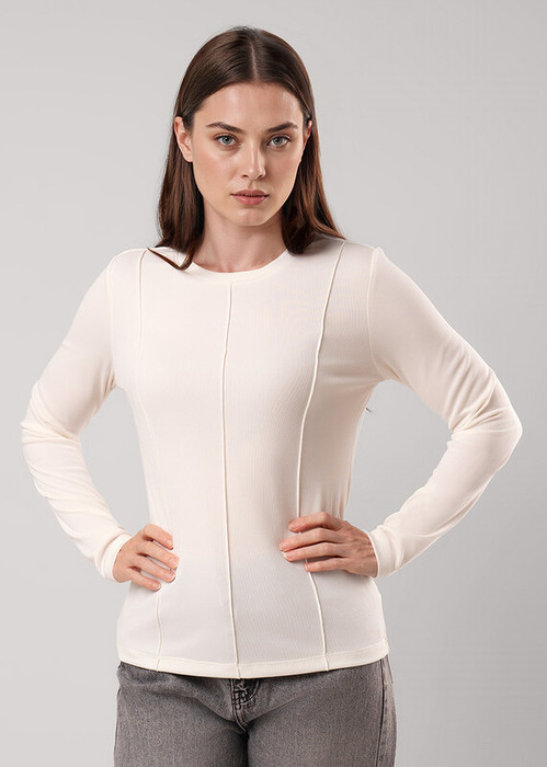 Фуфайка прямого силуэта из трикотажного полотна из полиэстера и эластана. Втачной длинный рукав. Округлая горловина с обтачкой. По переду и спинке декоративные защипы.
