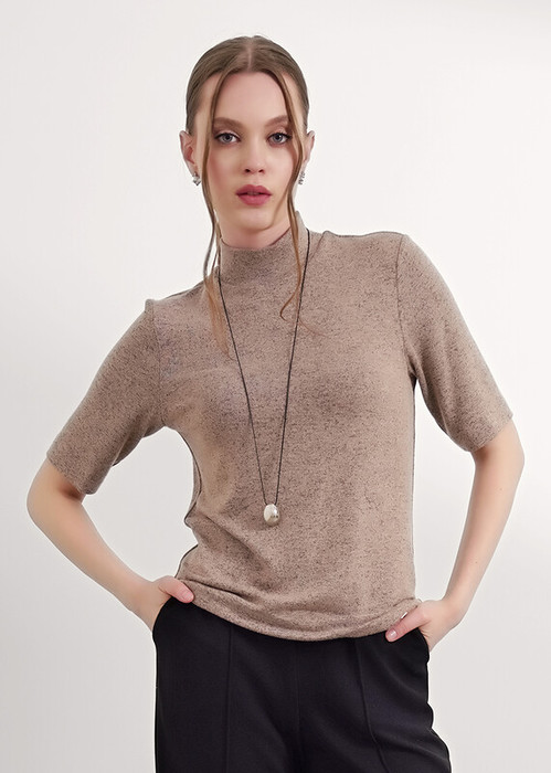 Джемпер прямого силуэта из трикотажного полотна вискоза вязаная. Втачной короткий рукав. По горловине стойка. Спереди нашивка металл.