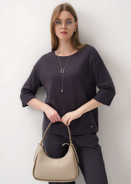 Вязаный джемпер прямого силуэта из вискозной пряжи с добавлением нейлона, переплетение гладь. Короткий спущенный рукав. Округлая горловина с бейкой. По горловине и низу изделия сдвоенная гладь, по рукаву ластичное переплетение. Спереди нашивка металл.