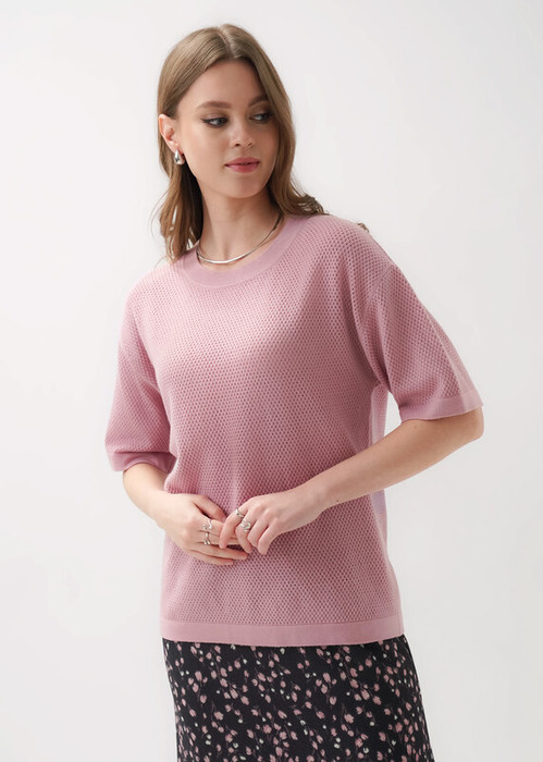 Вязаный джемпер прямого силуэта из вискозной пряжи с добавлением нейлона, ажурного переплетения. Короткий втачной рукав. Округлая горловина с бейкой. По низу изделия и рукава сдвоенная гладь.