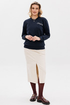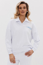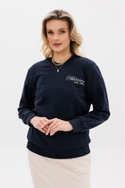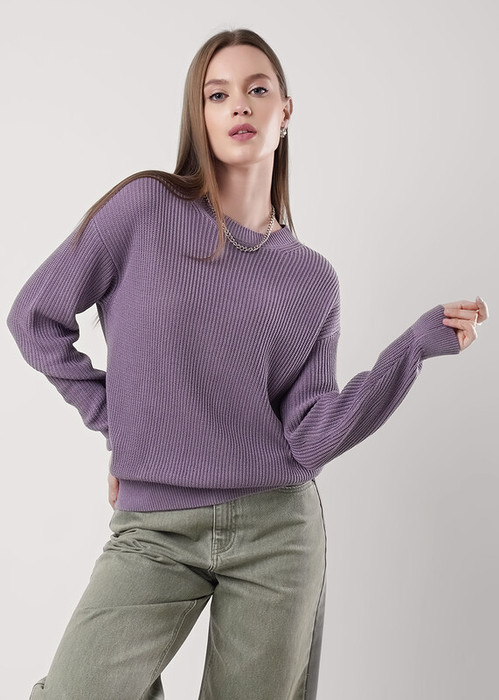Вязаный джемпер умеренного объема из акриловой пряжи с добавлением хлопка, переплетение полуфанг. Округлая горловина с бейкой. Длинный рукав со спущенной линией плеча. По низу изделия и рукава манжет. Спереди нашивка металл.