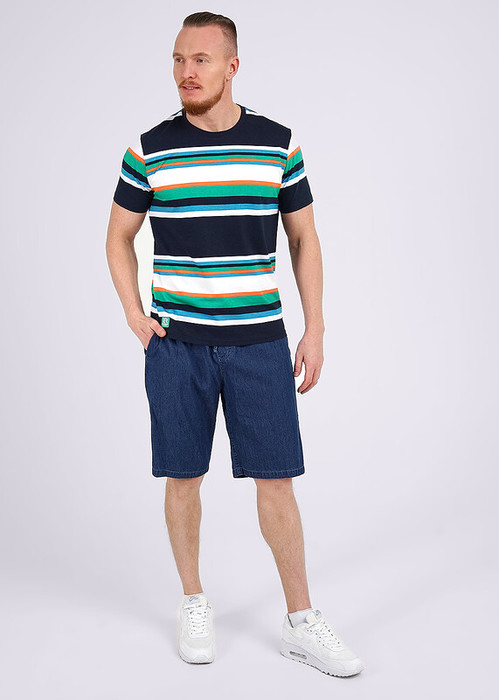 Футболка с круглым вырезом горловины, из дышащего хлопкового полотна. Интересное звучание модели придает яркая полосатая набивка и имиджевая фурнитура. Отличный вариант гардероба с джинсами на каждый день.