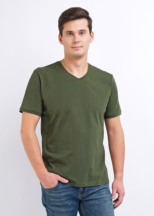 Базовая однотонная футболка стандартного объема с V вырезом горловины, втачным рукавом из хлопкового полотна с добавлением эластана. Является неотъемлемой частью мужского гардероба.