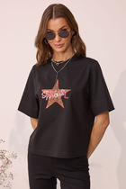 Футболка из трикотажного хлопкового полотна прямого кроя.Горловина с обтачкой с открытым срезом.Короткий втачной рукав.По низу изделия и рукава подгибка с открытым срезом. Спереди термопленка,термопайетки,принт с отлипом - в зависимости от цвета изделия.