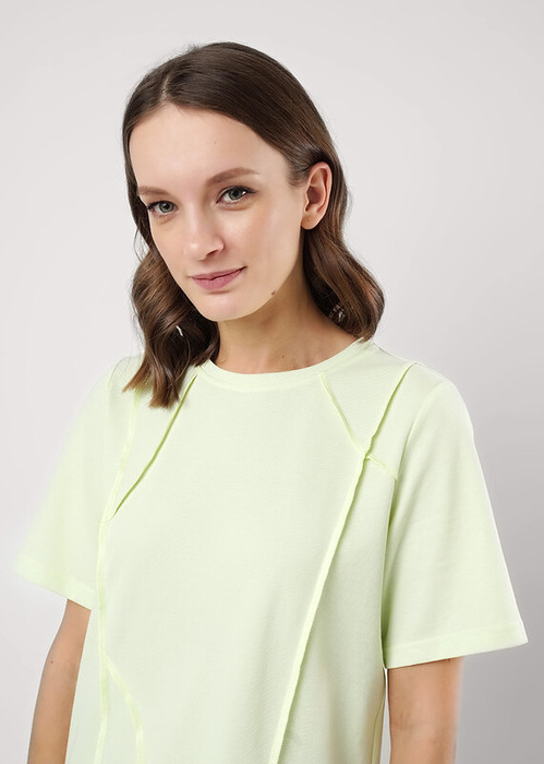 Футболка из трикотажного полотна пике, прямого кроя. Округлая горловина с обтачкой. Короткий втачной рукав. По переду и спинке декоративные резы, швами наружу обработанные на оверлоке.