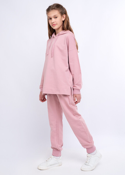 Толстовка для девочек на полотне футер с длинным втачным рукавом и капюшоном с атласным шнуром и металлическим наконечником внутри. Притачная манжета из кашкорсе.