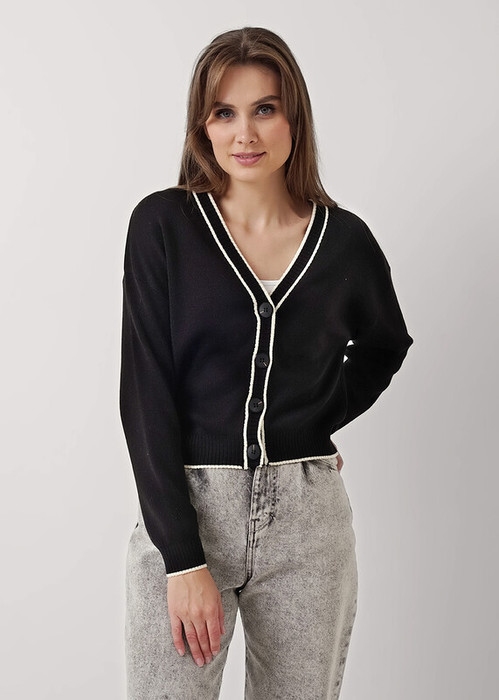 Вязаный жакет из вискозной пряжи с добавлением акрила, основное переплетение гладь.Спущенная линия плеча, V-образный вырез горловины, по горловине и борту планка с застежкой на пуговицы. По низу изделия и рукавов манжеты.