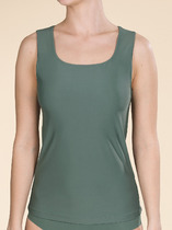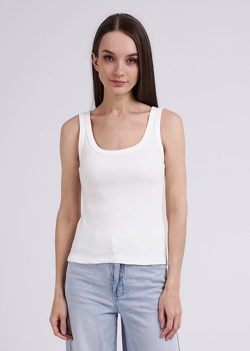 Майка из хлопкового трикотажного полотна рибана. Умеренный объем. Широкая бретель, округлая горловина. По горловине и пройме окантовка.