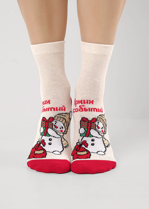 Носки женские с рисунком ""Снеговик с подарками"" и надписью ""Ярких событий!""