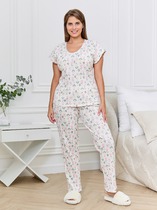 Пижама для дома и отдыха из трикотажного полотна кашкорсе. Футболка прямого кроя, короткий втачной рукав. Округлая горловина с обтачкой и застилом. Шорты прямые с внутренней резинкой. По низу футболки, рукавов и шорт мелкий оверлок.