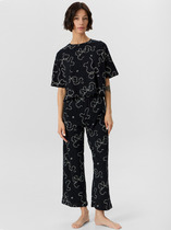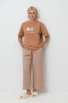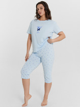 Пижама для дома из хлопкового трикотажного полотна.Футболка прямого кроя. Округлая горловина с обтачкой из кашкорсе. Короткий втачной рукав. На спинке внутренняя кокетка, застил. Шорты короткие,свободные. По талии притачная резинка жаккард, нашивка.