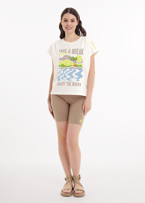 Набор одежды для дома и отдыха из трикотажного полотна.Футболка прямого кроя, горловина с обтачкой.Короткий цельнокроенный рукав,по плечу складки.Спереди и на плече принт,боковые разрезы.Сзади средний шов.Шорты с поясом на резинке,теромонаклейка силикон.