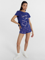 Пижама для дома и отдыха из трикотажного полотна кашкорсе. Футболка прямого кроя, короткий втачной рукав, округлая горловина с обтачкой, принт. По горловине контрастный застил. Шорты прямые с внутренней резинкой. По низу футболки и шорт мелкий оверлок.