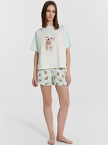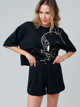 Набор одежды для дома и отдыха из трикотажного полотна. Футболка прямого силуэта из трикотажного полотна. Округлая горловина с обтачкой. Короткий втачной рукав. На полочке и спинке принт. Шорты с притачным широким поясом на резинке, принт.