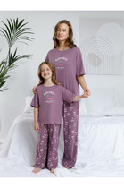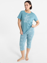 Набор одежды из хлопкового трикотажного полотна с модалом. Футболка прямого кроя. Короткий спущенный рукав. По горловине обтачка с кружевом. Спереди нашивка, сзади принт. Брюки прямые с поясом на внутренней резинке. По боковым швам узкое кружево, 2 ряда.