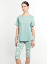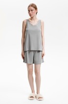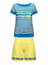 Пижама для дома из хлопкового трикотажного полотна с эластаном.Майка прямого силуэта, среднее плечо.По горловине и пройме окантовка с застилом, внизу нашивка.Короткие шорты с притачным поясом на внутренней резинке,спереди имитация гульфика с пуговицами.