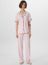 Пижама для дома из трикотажного полотна кашкорсе лапша. Майка укороченная. Узкая бретель. Округлый вырез горловины. По горловине и пройме окантовка.Спереди нашивка. По низу внутренняя резинка. Шорты прямого кроя, пояс на внутренней резинке, нашивка.