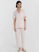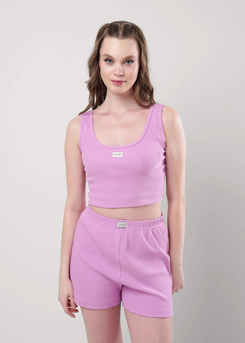 Пижама для дома из трикотажного полотна кашкорсе лапша. Майка укороченная. Узкая бретель. Округлый вырез горловины. По горловине и пройме окантовка.Спереди нашивка. По низу внутренняя резинка. Шорты прямого кроя, пояс на внутренней резинке, нашивка.