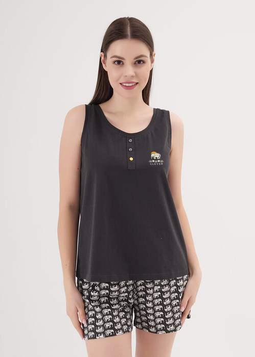 Пижама для дома и отдыха из хлопкового трикотажного полотна. Майка прямого силуэта. Округлая горловина, среднее плечо. По горловине и пройме обтачки. Спереди нефункциональная планка с пуговицами. Спереди принт. Шорты с поясом на внутренней резинке.