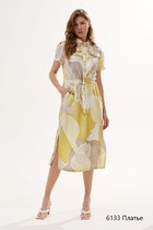Платье из вискозного трикотажного полотна,немного расклешенное книзу.Длиной выше колена.По горловине отложной воротник.Спереди притачная планка, застежка на пуговицы в два ряда. Втачной длинный рукав,по низу рукава высокий манжет с застежкой на пуговицы.