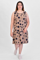 Платье для дома и отдыха из хлопкового трикотажного полотна прямого кроя, длиной до колена. Короткий втачной рукав. Округлая горловина с обтачкой. По бокам разрезы. Спереди принт.