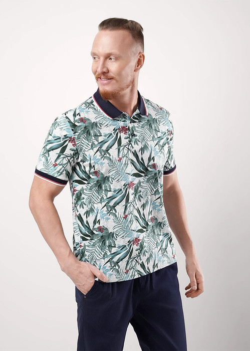 Футболка- поло мужская из фактурного полотна ""флам"" с растительной набивкой. Футболку дополняют вязаные отделки и имиджевая фурнитура. Подойдет для прогулок с друзьями.