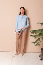 Куртка прямого силуэта из трикотажного полотна джерси. Отложной воротник на стойке. По переду планка с застежкой на пуговицы, на спинке кокетка с бантовой складкой. Длинный рукав со спущенной линией плеча, внизу манжет на пуговице. Фигурный низ изделия.