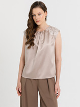 Блузка прямого силуэта из трикотажного полотна, с отложным воротником на стойке. Спереди цельнокроеная планка с застежкой на пуговицы. Длинный втачной рукав, внизу с притачной манжетой и застежкой на пуговицу. По спинке кокетка со складкой.