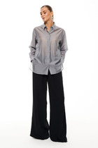 Блузка из текстильного полотна лен с вискозой,прямого силуэта. Длинный рукав со спущенной линией плеча, по низу манжет с разрезом. По борту цельновыкроенная планка с застежкой на пуговицы, по горловине отложной воротник со стойкой. По бокам разрезы.