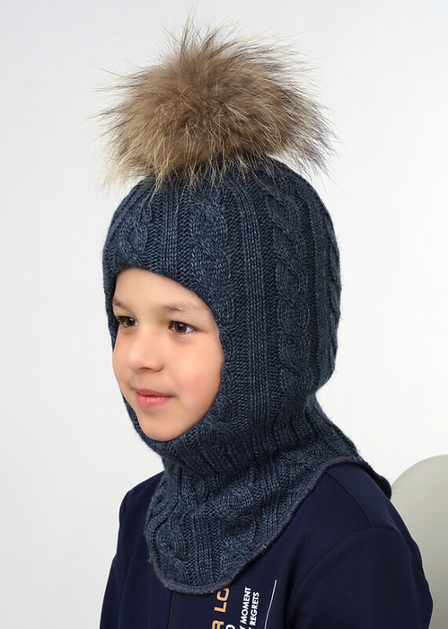 Шапка-шлем выполнен фактурным переплетением ""косы"", в области шеи - ластичная ножка для более плотного прилегания. Модель на синтепоне с хлопковым подкладом и натуральным помпоном на кнопке.