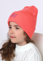 Стильная детская двойная шапка с отворотом, связаная ластичным переплетением, декорирована силиконовой нашивкой в центре.