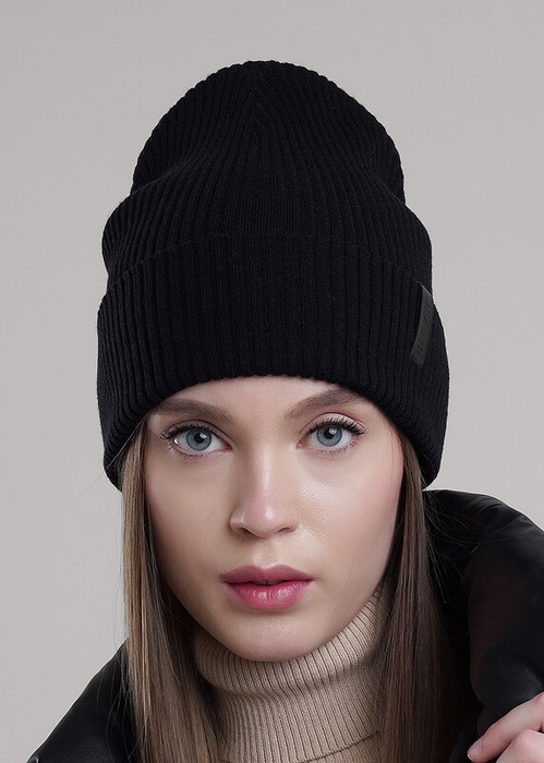 Стильная женская шапка двухслойная, с отворотом, без подклада, декорирована имиджевой нашивкой логотип. Подходит для холодной осени, тёплой зимы.