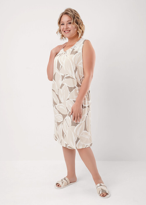 Ночная сорочка из хлопкового трикотажного полотна с добавлением модала, без рукавов. А-образного силуэта, длиной чуть ниже колена. В плечевой части переда декоративная кружевная вставка. По горловине и пройме окантовка. Спереди по горловине бант.