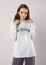 Куртка спортивная из трикотажного полотна футер,на молнии. По горловине капюшон на подкладе со шнуром. Длинный рукав со спущенной линией плеча, нашивка.По низу рукава и изделия манжеты. Спереди карман кенгуру, принт.По пройме и шву рукава открытый срез.