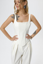 Блузка из атласного полотна немного расклешенная книзу. Тонкие бретели с регулировками. V- образная горловина. По горловине кружево.