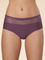 Бикини комфортной посадки из сетки. По ножкам -кружевная тесьма, по поясу - резинка с фестоном. По переду - симметричные кружевные вставки и небольшой атласный бант.
