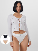 Классическая модель из однотонного трикотажа. Деталь переда симметрично декорирована кружевом По ножкам спереди и по талии - резинка с фестоном. На детали переда по центру - небольшой атласный бант.
