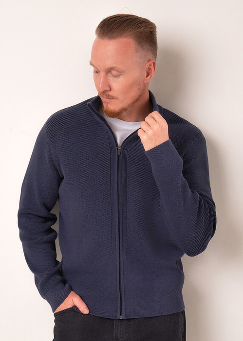 Жакет мужской на молнии с длинным рукавом и воротником стойкой связанный фактурным переплетением. Прекрасное решение на холодное время года. Данное изделие комфортно и практично в носке, прекрасно сохраняет тепло. Комбинируется с джинсами или брюками.