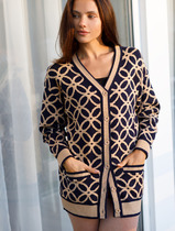 Вязаный жакет из вискозной пряжи с добавлением акрила, свободного силуэта на молнии переплетения гладь. По горловине отложной воротник. Длинный втачной рукав. По низу изделия и рукавов манжеты. По воротнику и манжетам ластичное переплетение.