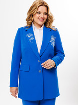 Жакет из трикотажного поливискозного полотна джерси, прямого силуэта. Однобортный с застежкой на пуговицы, по борту внутренняя обтачка. Длинный втачной рукав. Спереди прорезной карман с клапаном. По низу изделия и рукава потайной стежок.