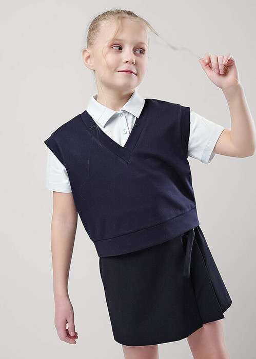 Стильный базовый жилет из трикотажного полотна станет модной новинкой в твоём гардеробе! Комфортная посадка по фигуре, актуальный объём и практичная цветовая гамма- то, что нужно для создания повседневного школьного образа и отличного настроения!