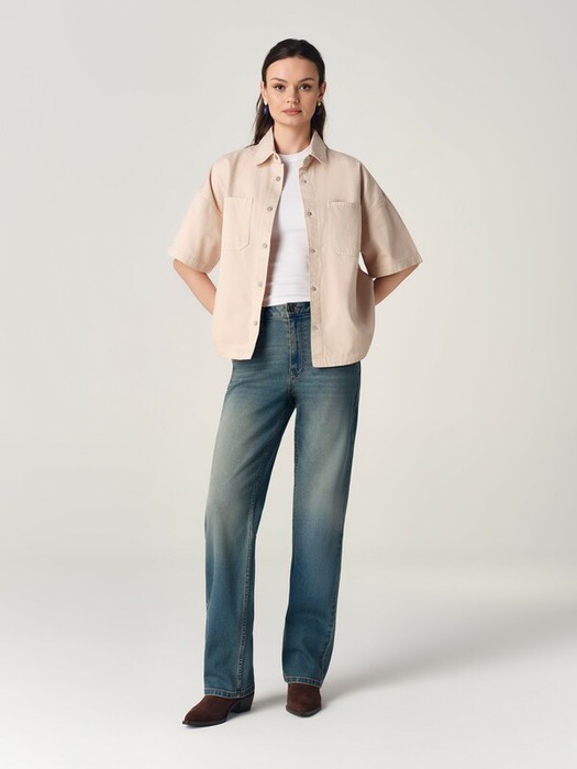 Джинсы straight из плотного синего денима с тинтом в тёплых тонах станут эффектной основой стильных расслабленных образов. Акцентные вертикальные вытачки спереди, эффектные вытачки на задних карманах подчеркнут выразительность фигуры, а  винтажная варка и фурнитура цвета медь антик добавят образу характер и передадут его аутентичность.